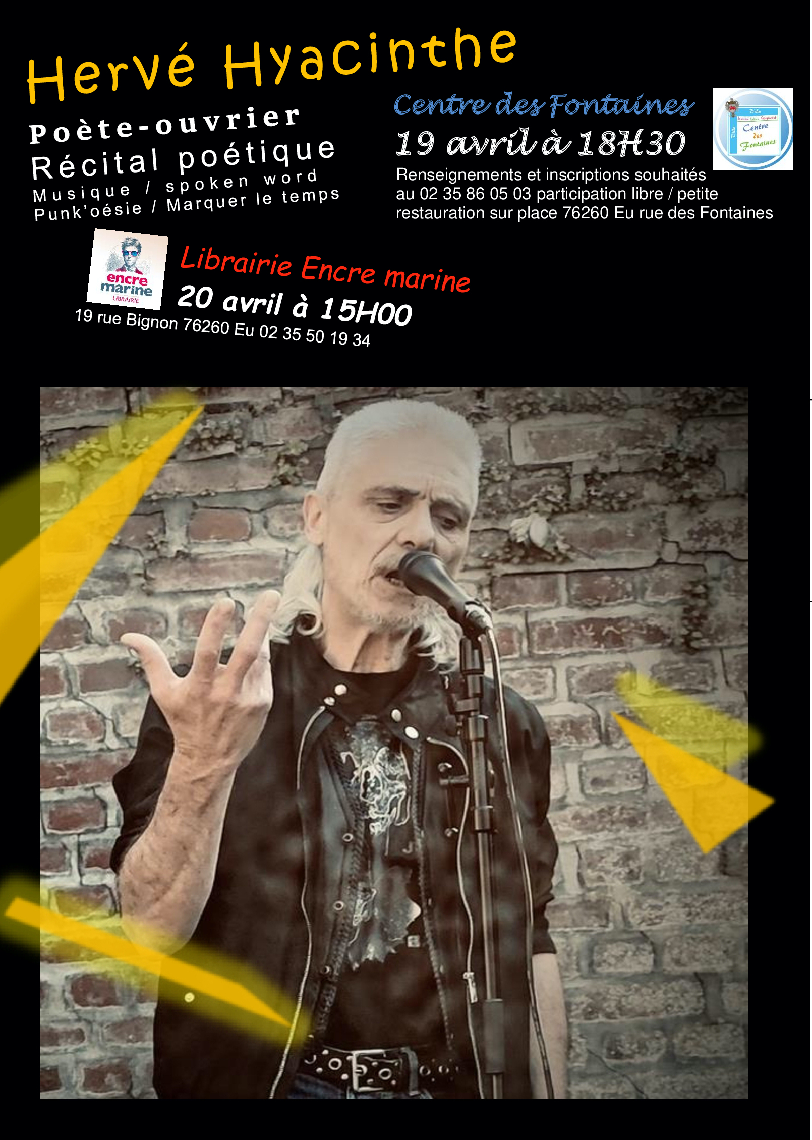 Hervé Hyacinthe, poète-ouvrier sera en concert au Centre des Fontaines le 19 avril à 18h30 pour un récital poétique (#Musique / #SpokenWord / #Punk’oésie #MarquerLeTemps).